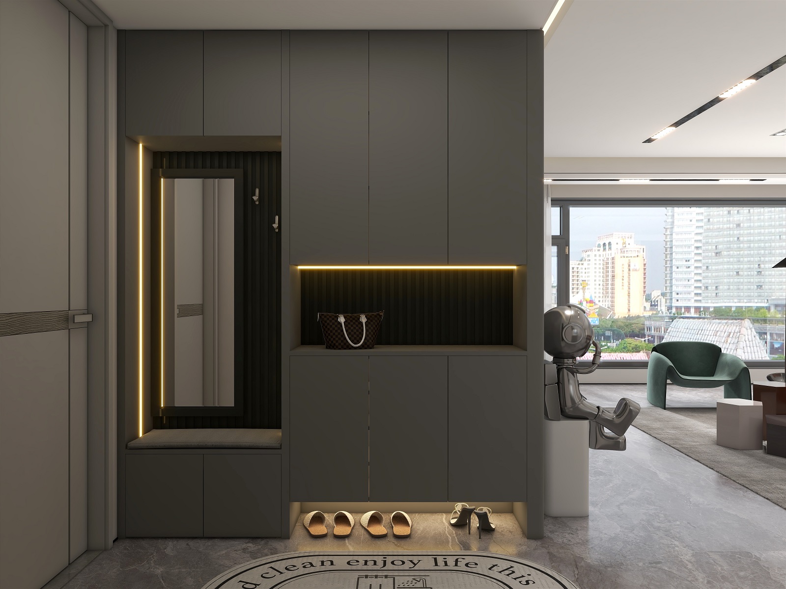 大面积运用深灰色,格栅元素极具设计感,在层板灯的渲染下整个玄关轻奢有内涵,给空间增添了几分自然纯粹的气息,让人身心放松。